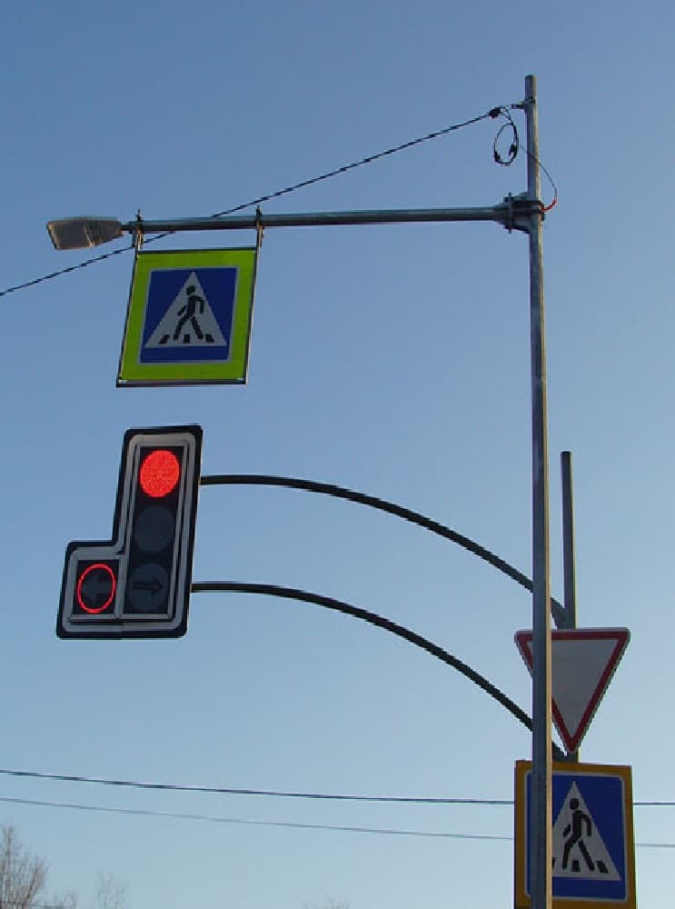 Это ещё один вид специальной дорожной конструкции, которую можно встретить практически на каждом перекрестке. На данные опоры устанавливаются регулирующие консоли, известные нам, как, светофор.